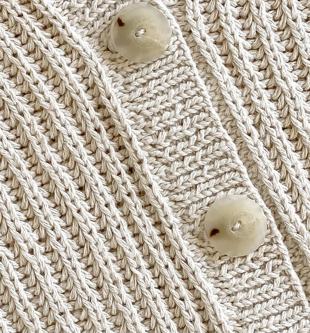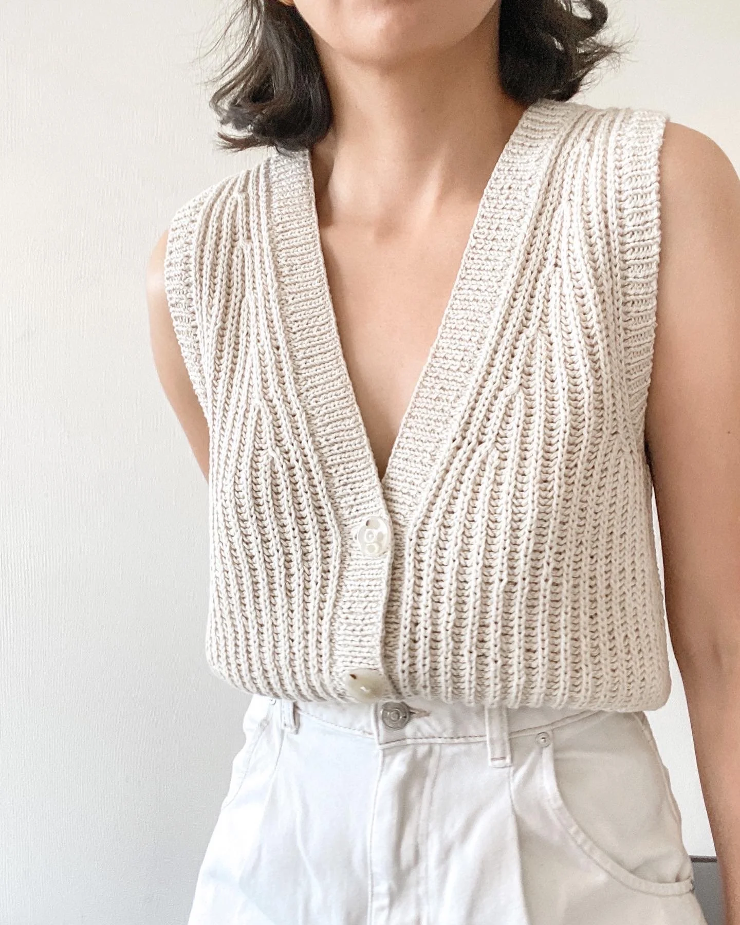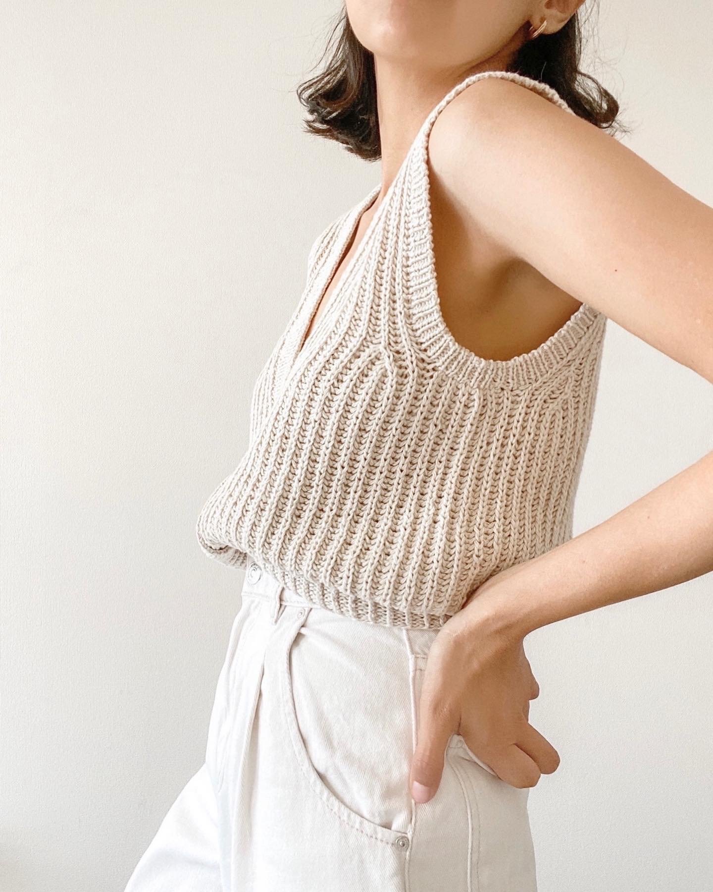 El vest Rachele esta tejido en punto brioche suelto para que la prenda quede con caída y aireada. Se teje de abajo hacia arriba.